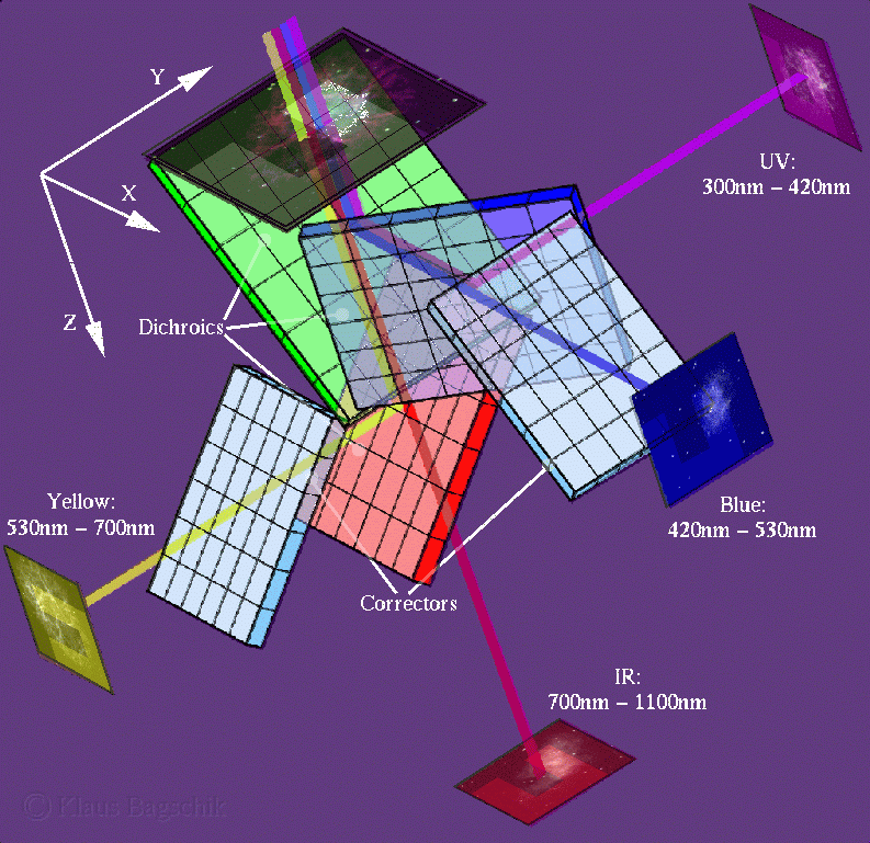 The color given to the dichroics in the image above hints at their transition wavelength, i.e. the changeover from predominately reflecting to mostly transmitting the incoming light. The primary dichroic (green) splits the light into two regions, reflecting shortward of 530nm and transmitting longward thereof. The blue secondary dichroic receives the light reflected by the primary and has a transition wavelength of 420nm, wheras the one hit by the transmitted light (red) starts transmitting longwards of 700nm. Astigmatism correctors are depicted in pale blue.