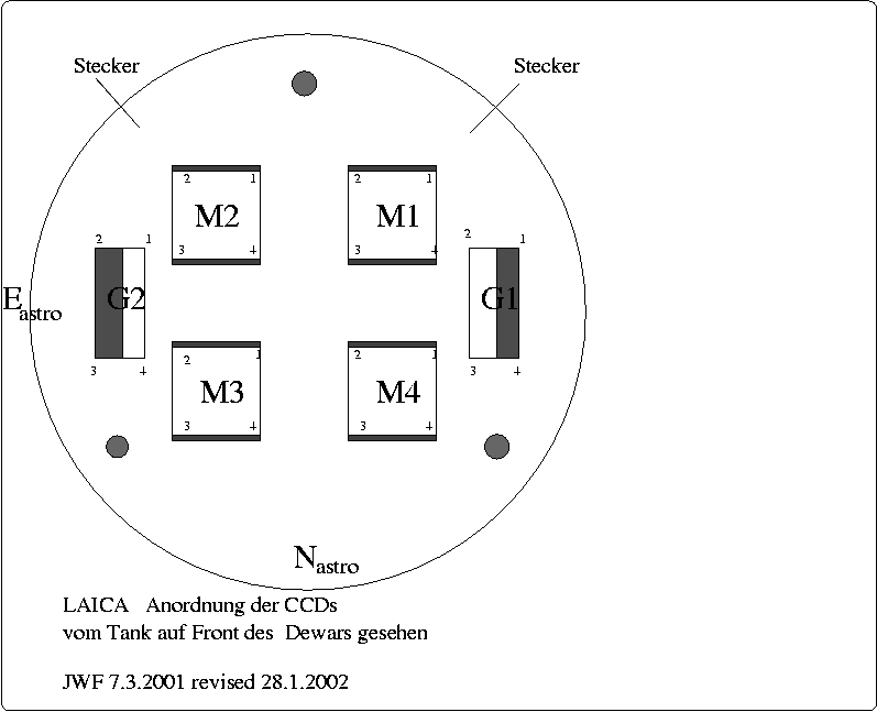 The arrangement of the CCDs is shown here as CAD image and a true foto here . In order to get a contiguous field, one has to fill in the gaps between the CCDs, i.e. 4 telescope pointings are needed for full coverage of a 1 square degree field (see illustration). There is a macro (@@ expose) to facilitate this and procedures to assemble a mosaic of the 16 images will become available (see here). The data are stored on disk in FITS format. Each exposure creates 4 files, one for each CCD. If the root of the filename you entered in the GUI is eg. JAN12 , and you have already 10 files on disk, the next exposure will produce files JAN120011_1.fits, JAN120011_2.fits, JAN120011_3.fits, JAN120011_4.fits for CCD 1,2,3 and 4, respectively. The numbering scheme of the CCDs is: